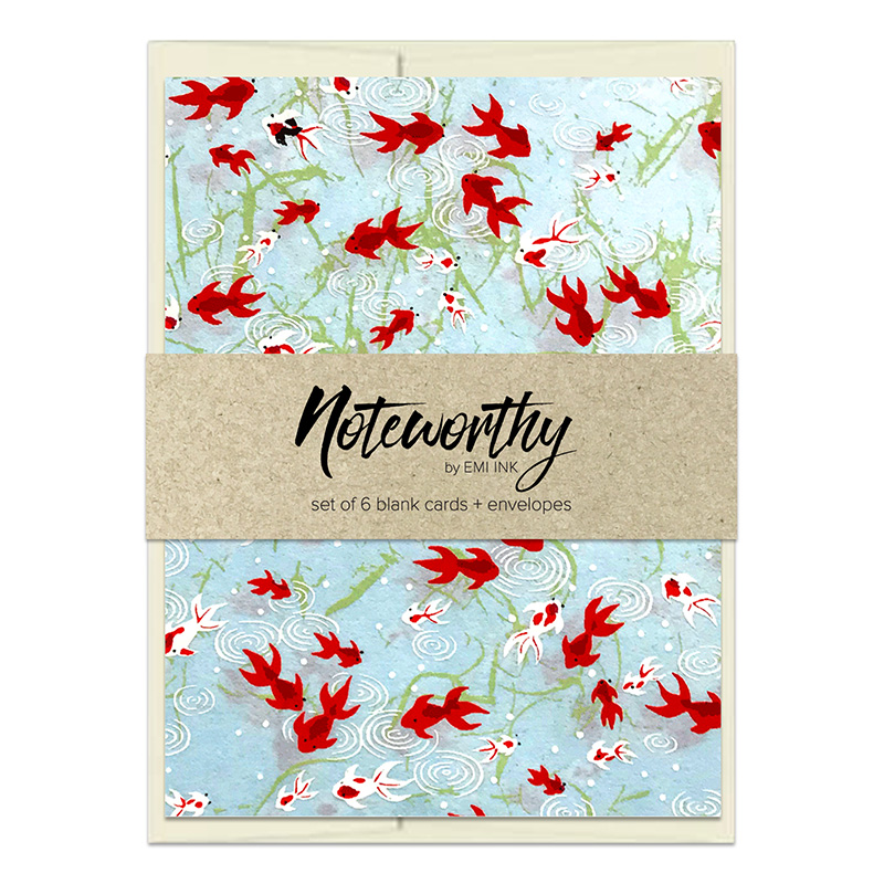 Printed on textured Japanese washi, this set of six blank notecards is perfect for lighthearted hellos, encouragement, or everyday notes that make a splash. Paired with coordinating envelopes and wrapped in a kraft paper band, each set is ready to gift or keep.