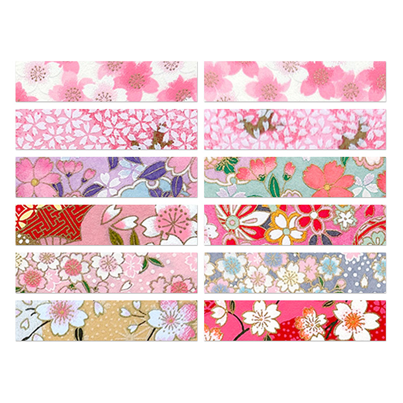 A curated set of sakura washi tape strips featuring all 10 designs from the 2026 Sakura Collection. Each strip is hand-cut from Japanese chiyogami washi paper, showcasing delicate cherry blossom patterns in a soft, harmonious mix of pinks, florals, and seasonal motifs. To complete the set of 12, two of the pink sakura designs are intentionally repeated.
