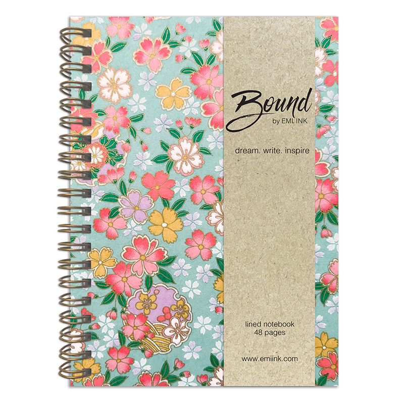 This washi notebook features a soft mint background scattered with sakura blossoms in shades of pink, yellow, and lavender, accented with subtle gold detailing. Fresh and uplifting, the design brings a light, airy feel to your everyday writing.