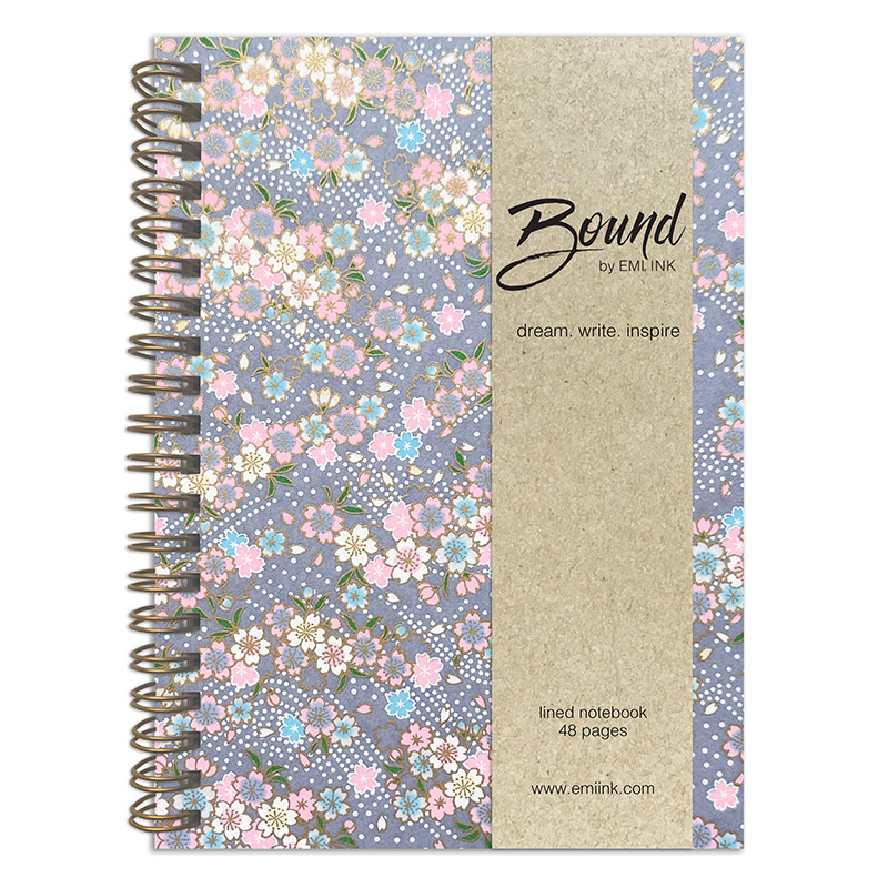This washi notebook features a soft gray background scattered with sakura blossoms in shades of pink, blue, and cream, accented with subtle gold detailing. Calm and balanced, the design brings a quiet, refined feel to your everyday writing.